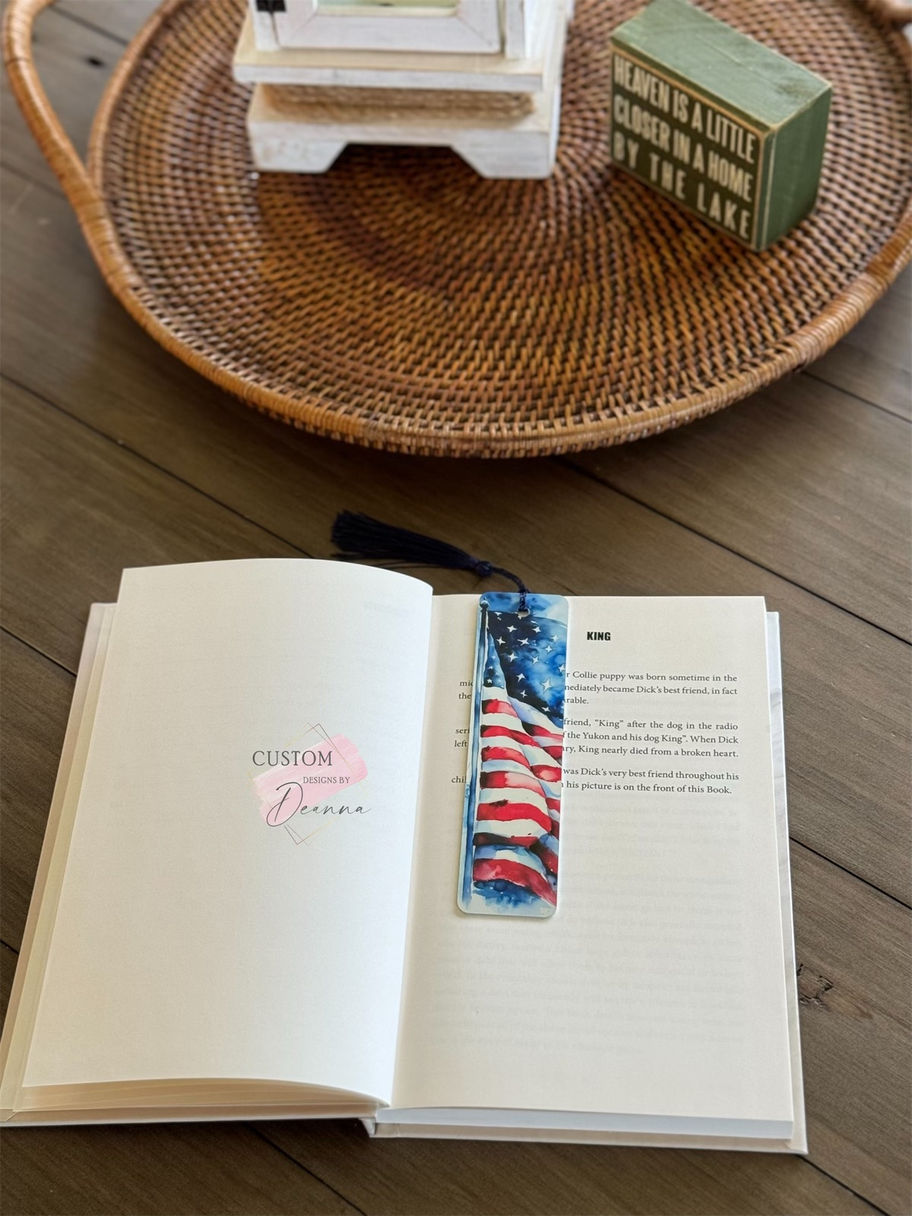 Bookmarks are made from aluminum, measuring 1.5″ x 6″. Design is double sided. Tassel included, color varies based on availability. Most designs can be personalized or customized… send me message to discuss!